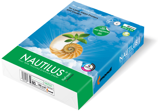 Nautilus® Refresh Triotec è l'ultima nata nella famiglia Nautilus®. Prodotta con l'esclusiva tecnologia Triotec®, contiene nello strato interno il 30% di fibra riciclata e negli strati esterni fibra vergine sbiancata senza cloro TCF (Totally Chlorine Free). Carta con certificazione ambientale che garantisce l'utilizzo di materie prime provenienti da foreste gestite e Ecolabel, che attesta il ridotto impatto ambientale nel suo intero ciclo di vita.